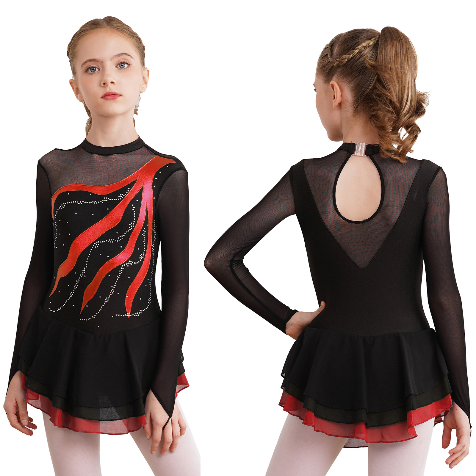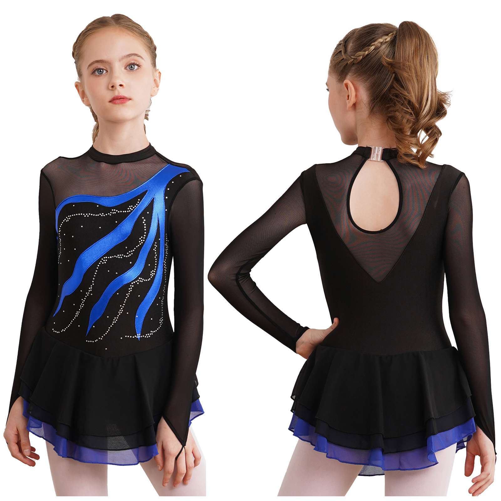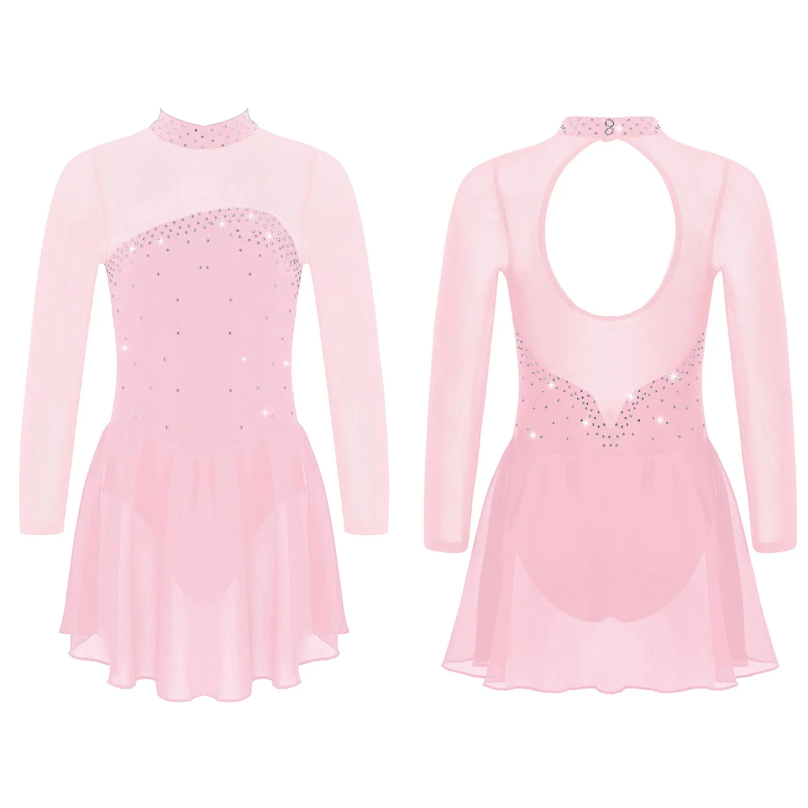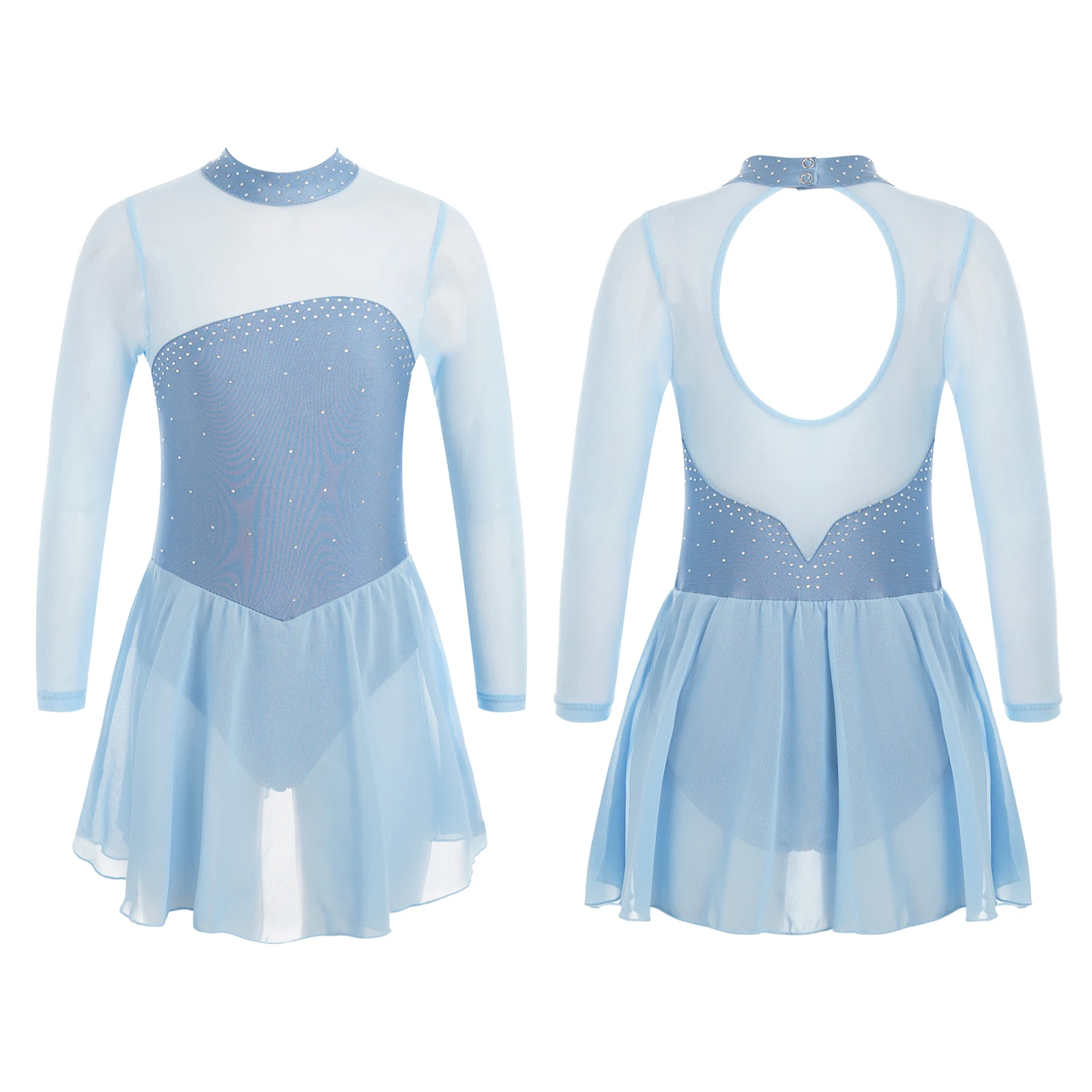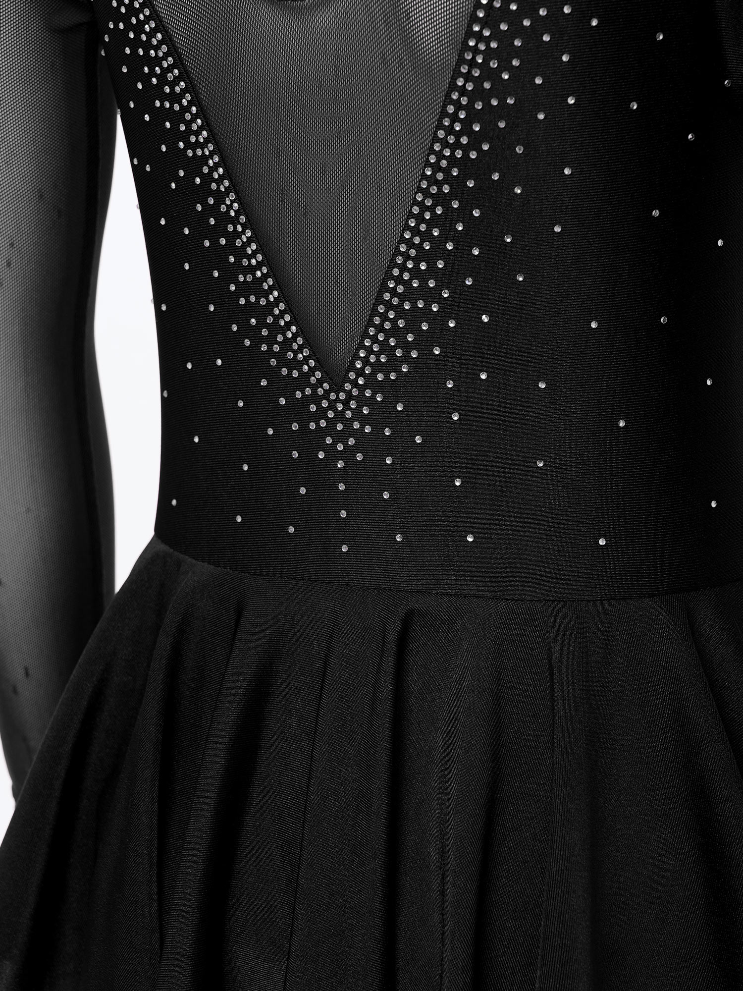 The dress features with long sleeve and round neckline, v shape rhinestone decorated in the front and back, hollow back.