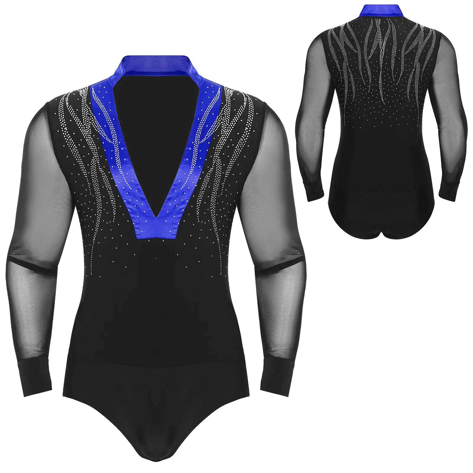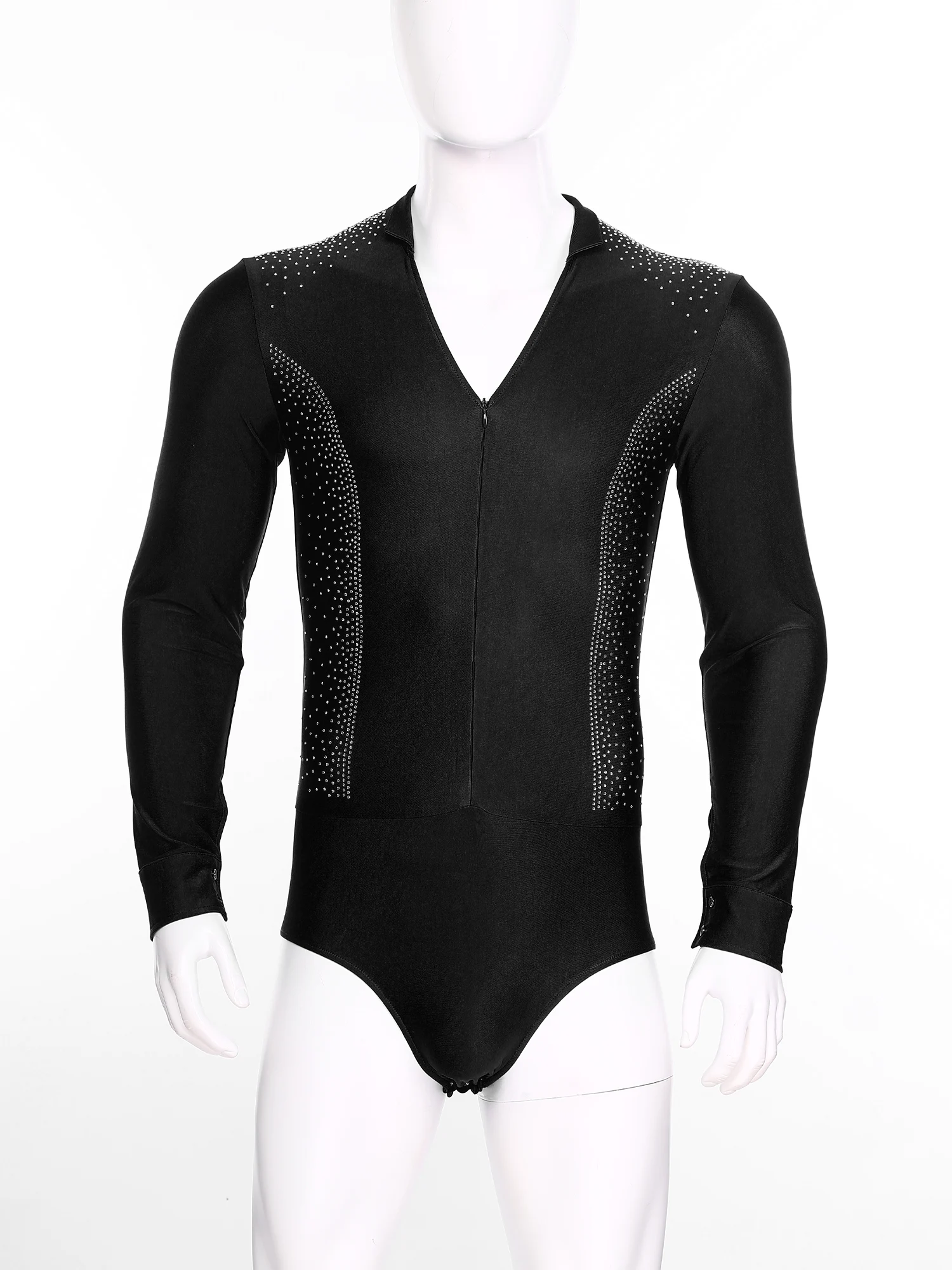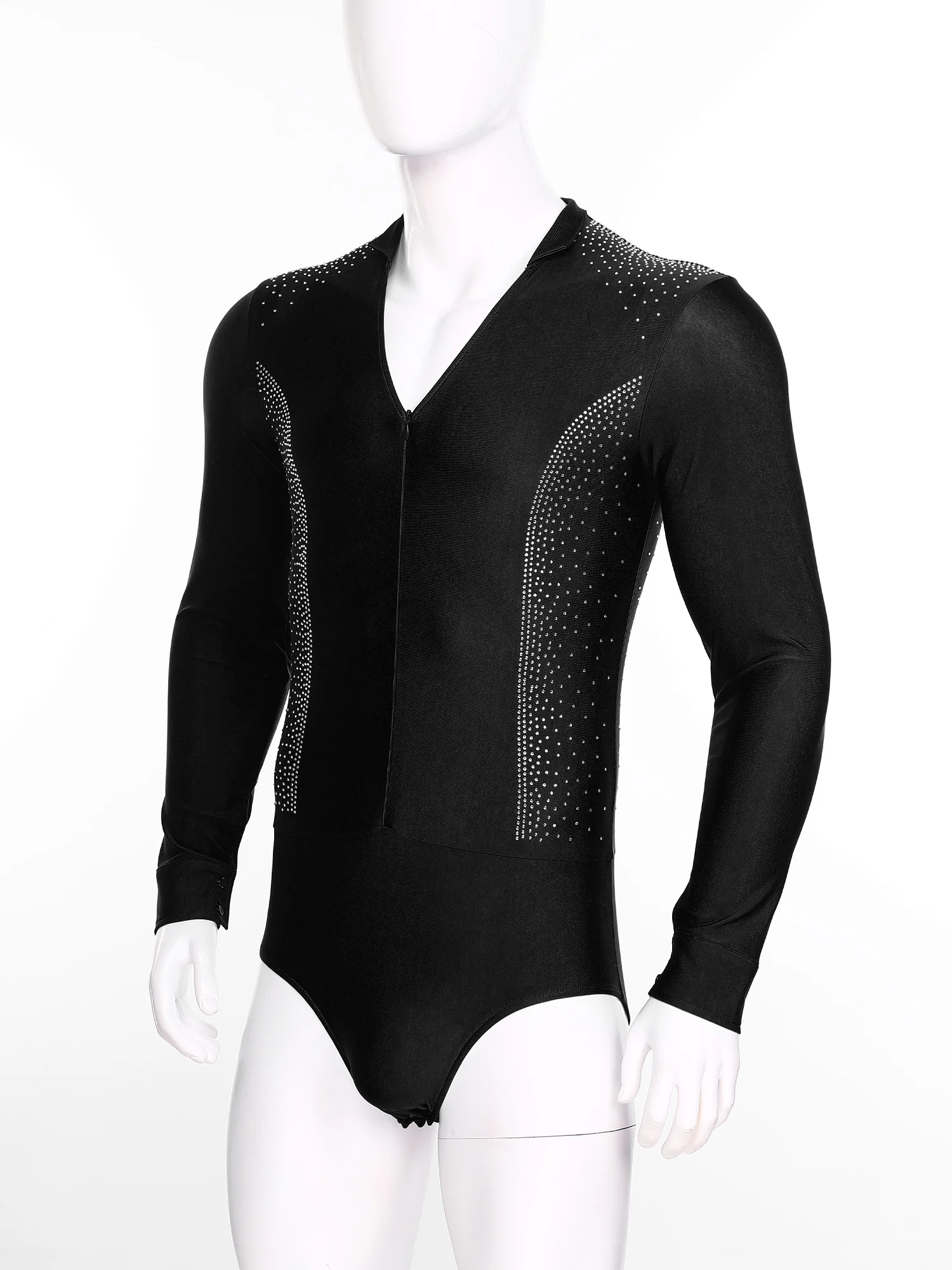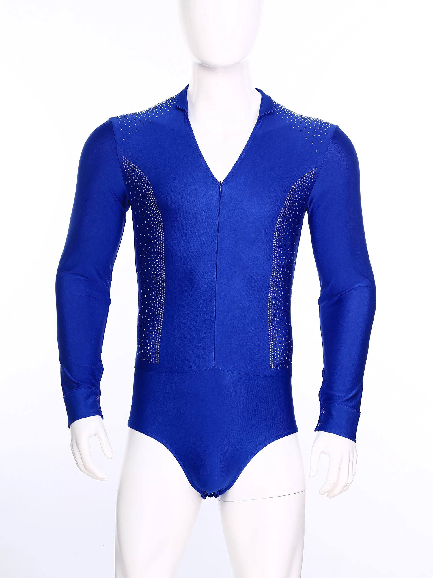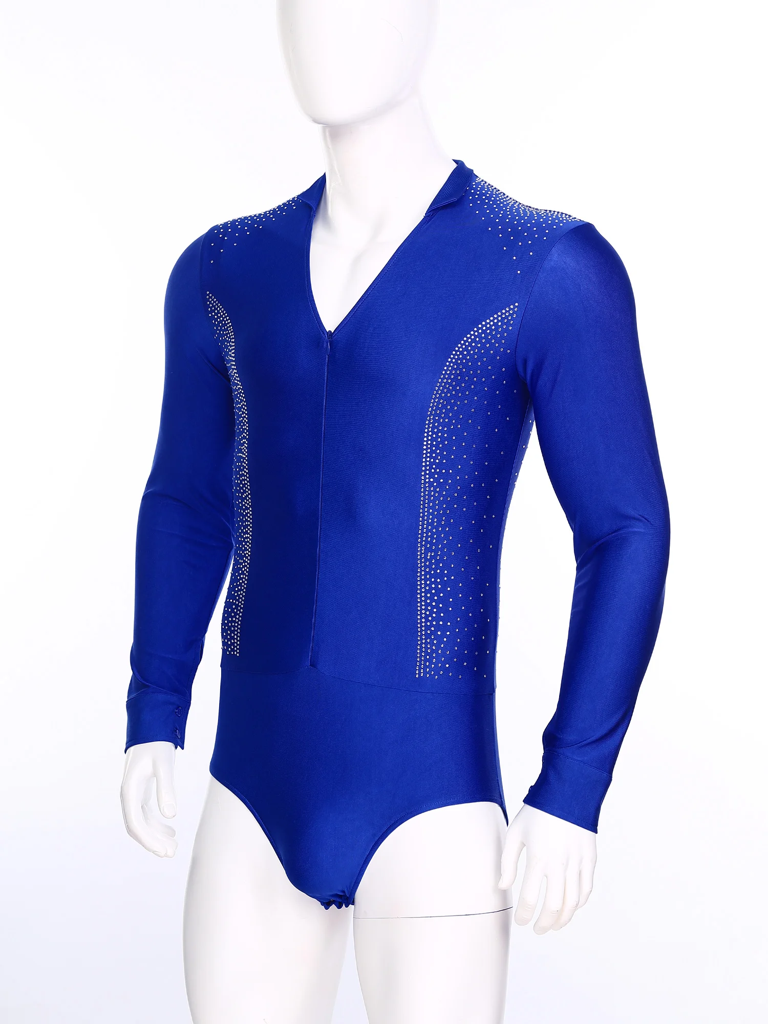 Men Latin Dance Leotard Figure Skating Ballet Ballroom Dancing Tango Performance Costume Long Sleeve Shiny Rhinestones Bodysuit