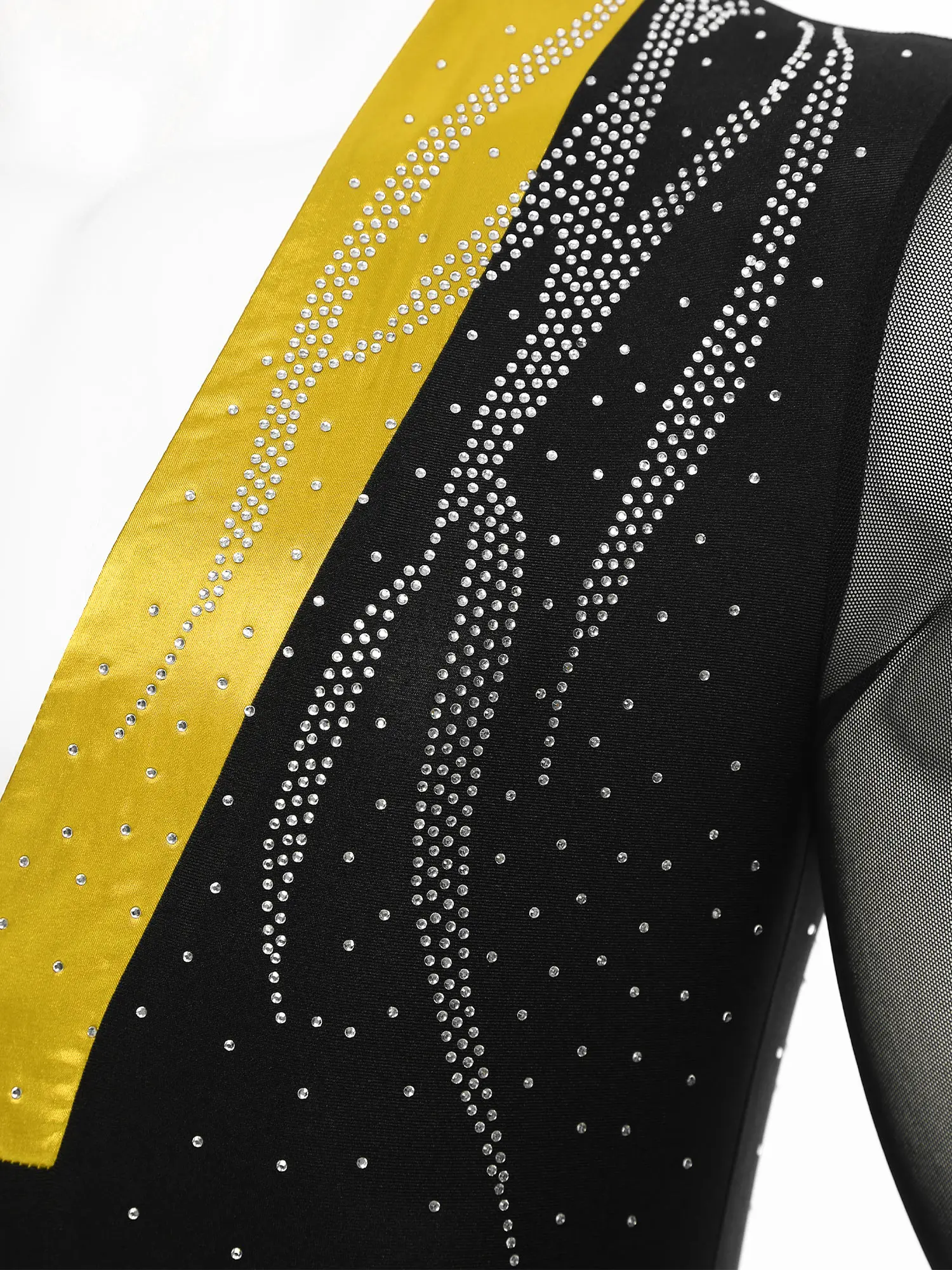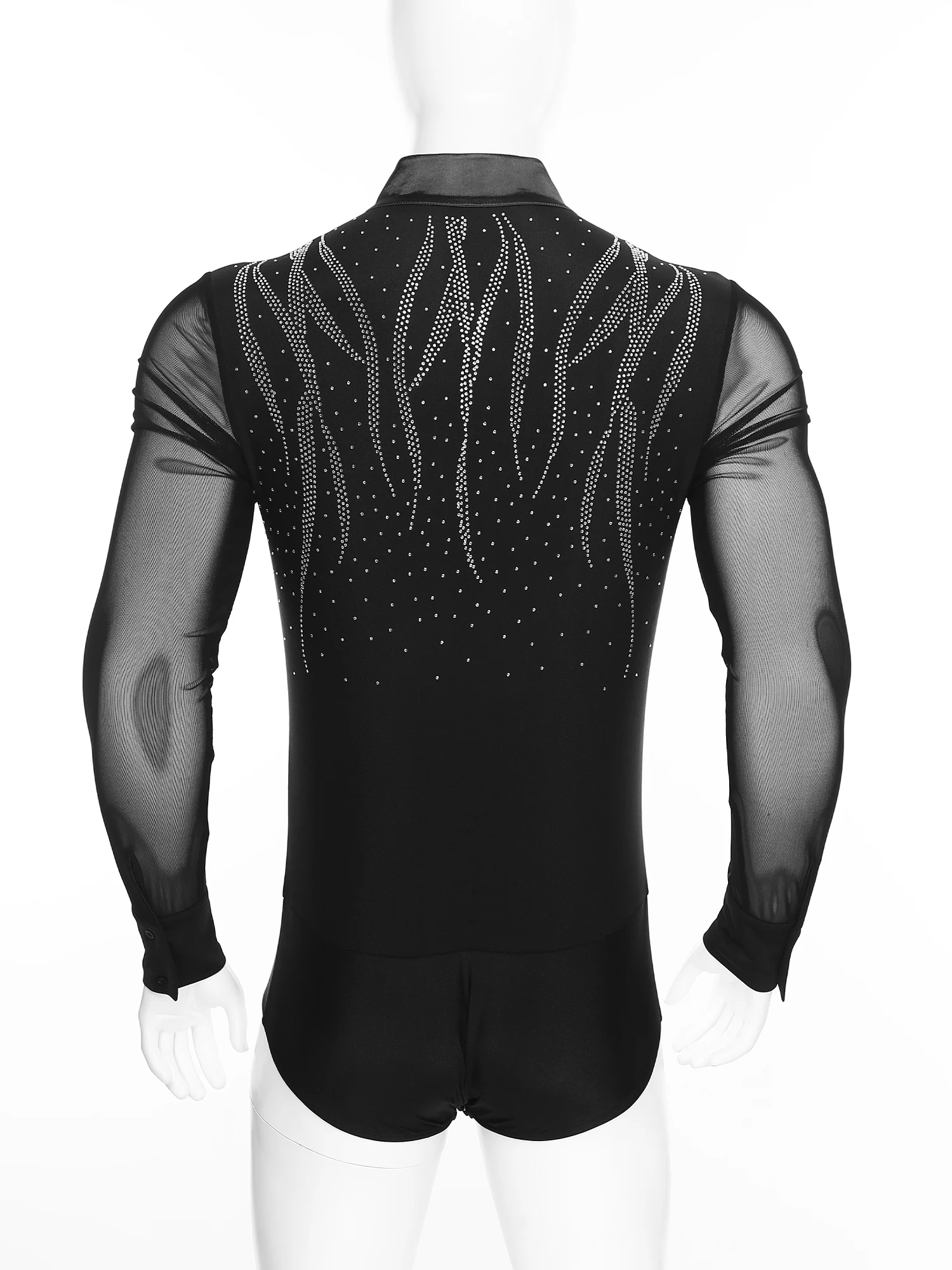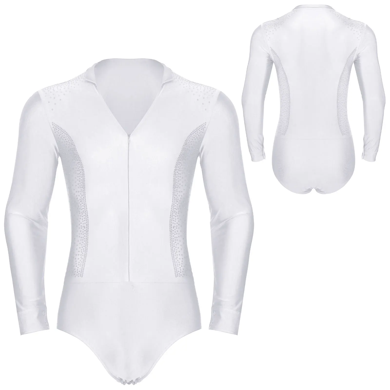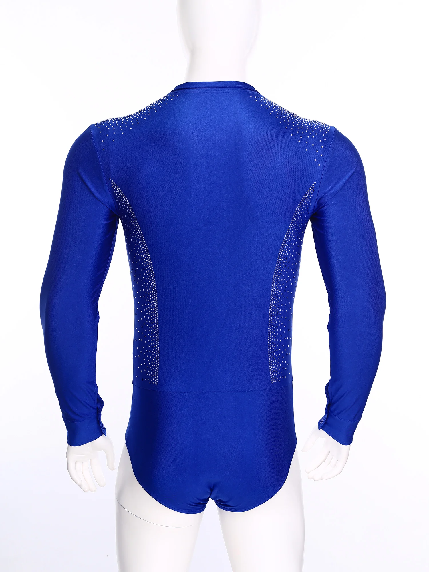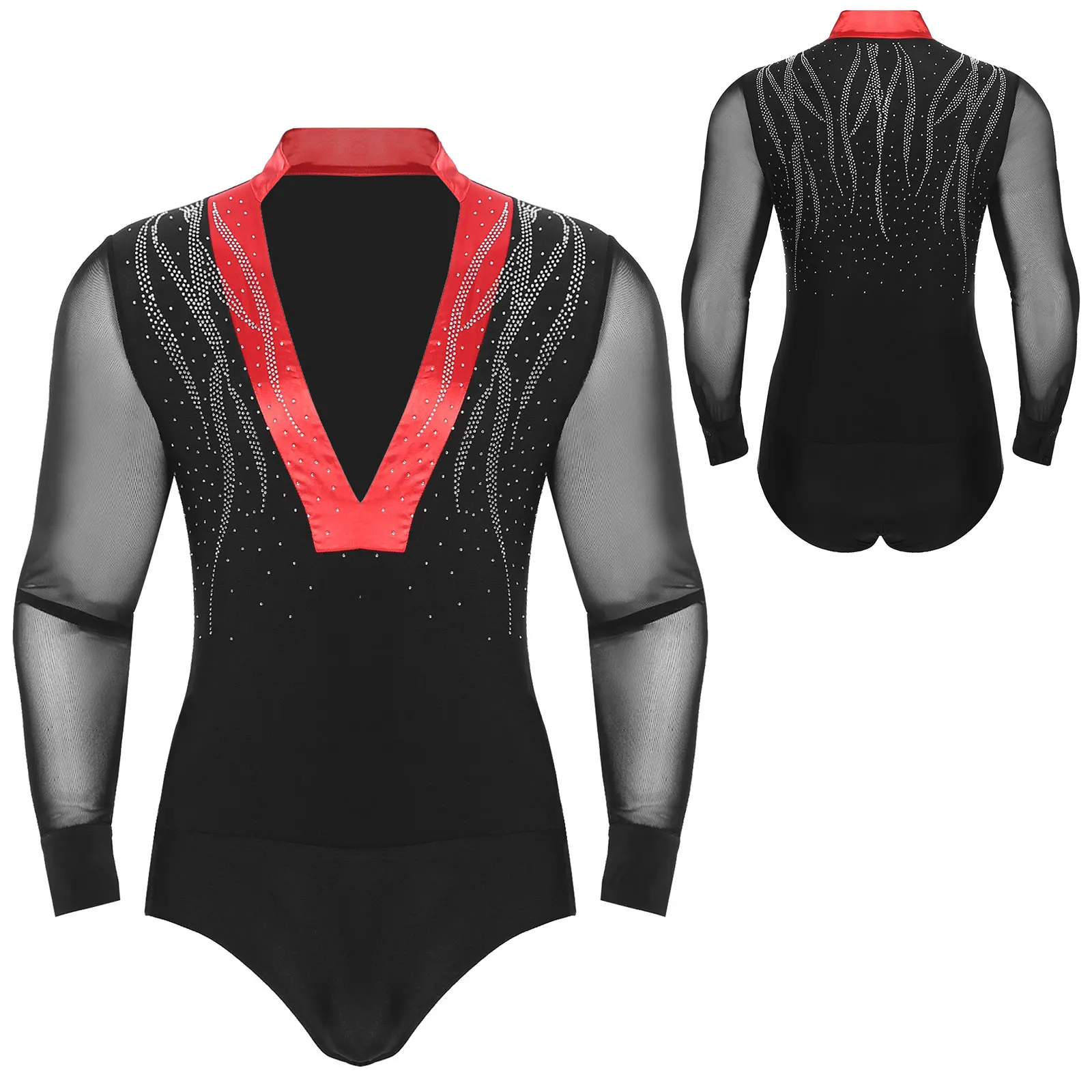 Men Latin Dance Leotard Figure Skating Ballet Ballroom Dancing Tango Performance Costume Long Sleeve Shiny Rhinestones Bodysuit