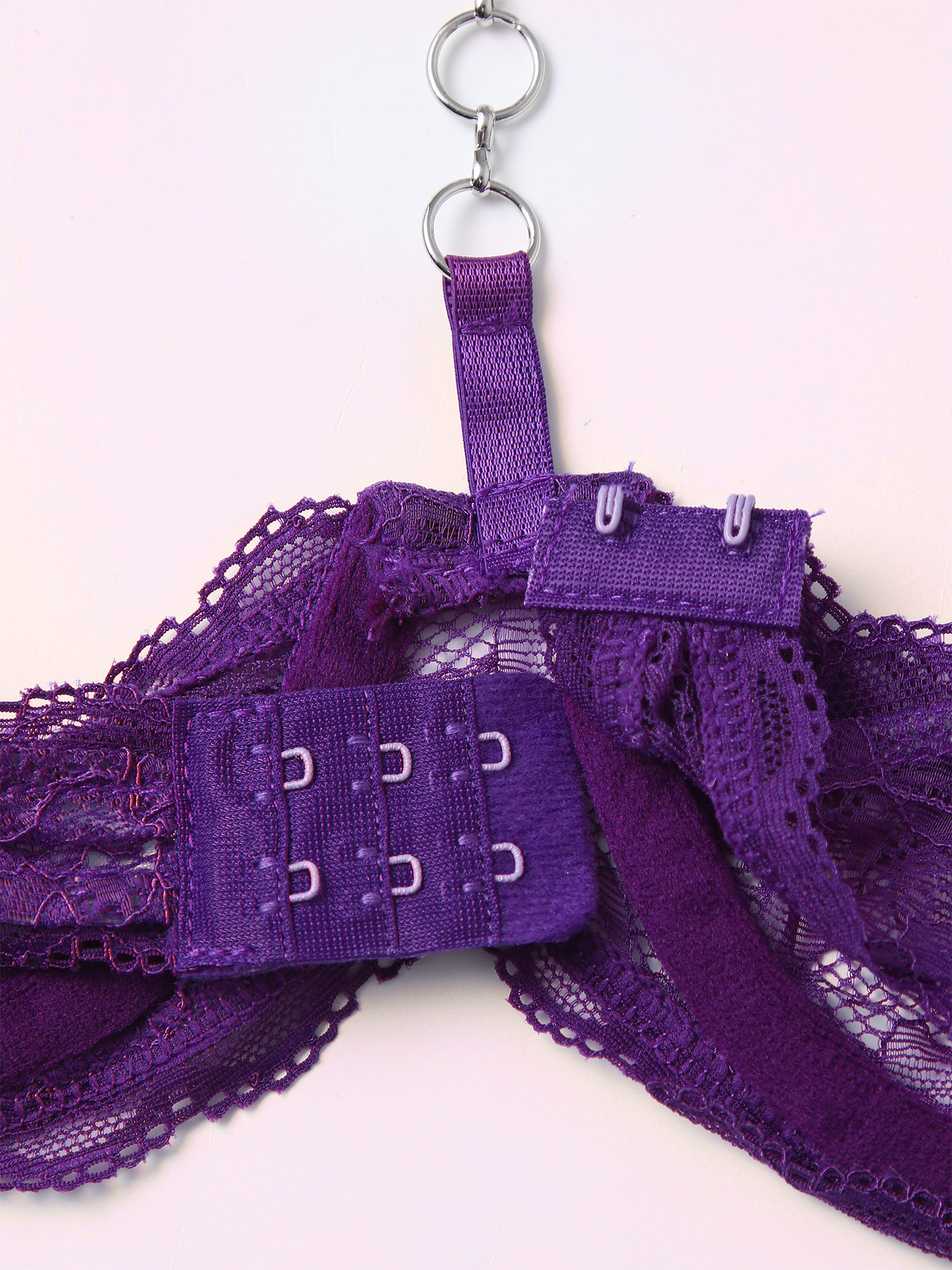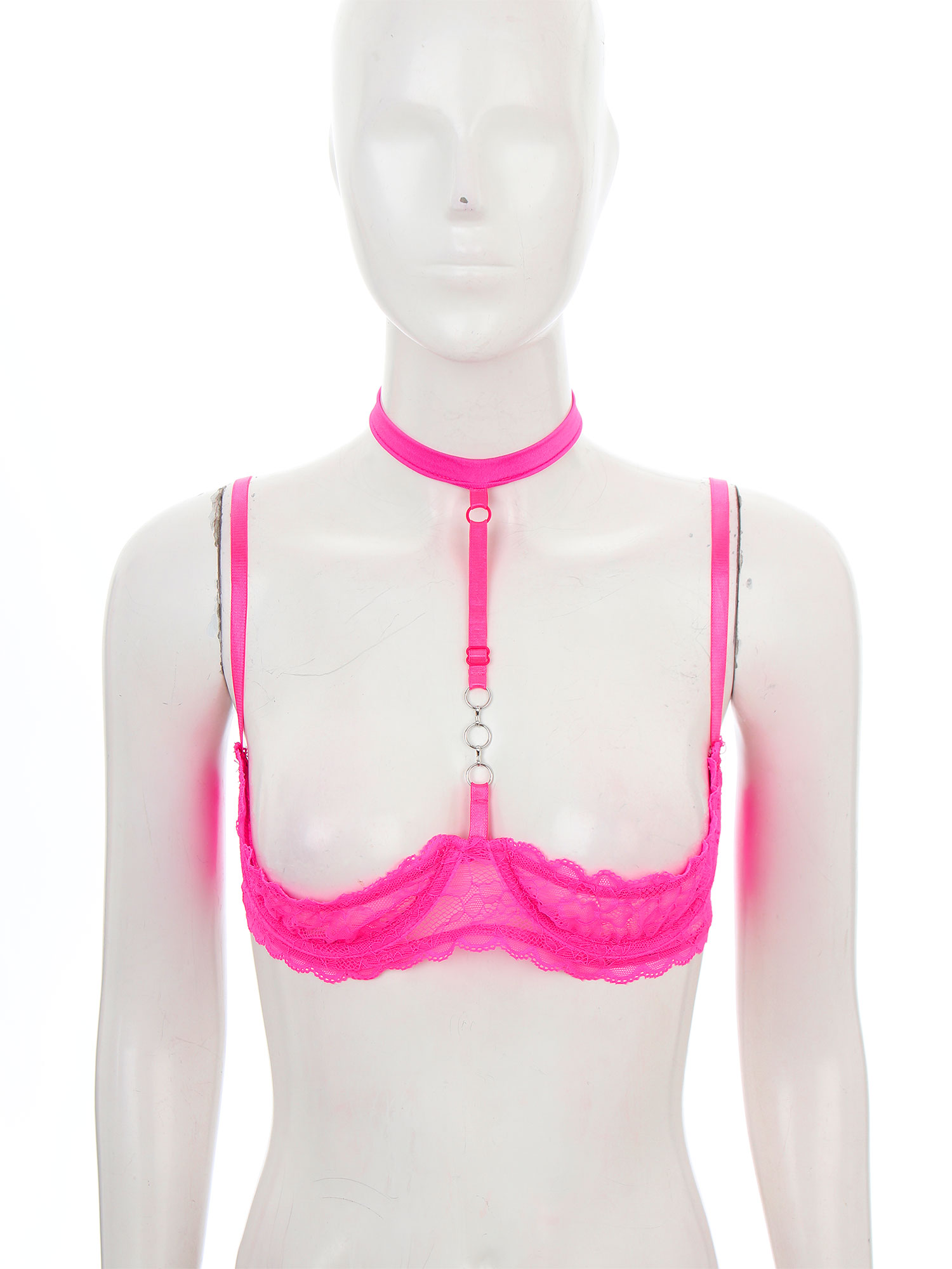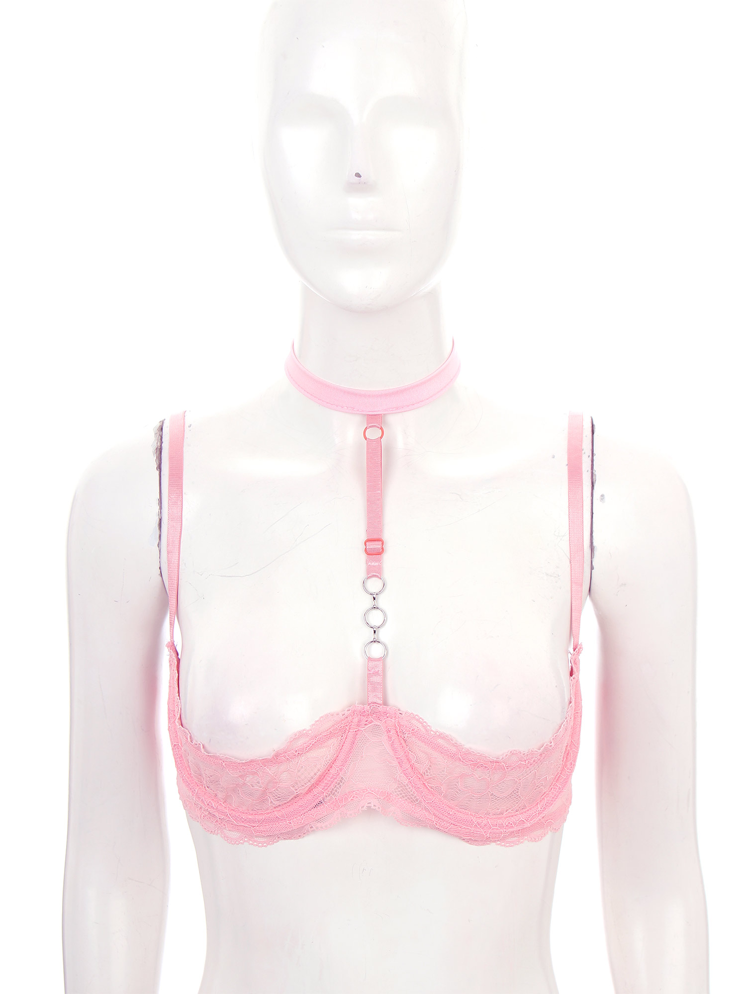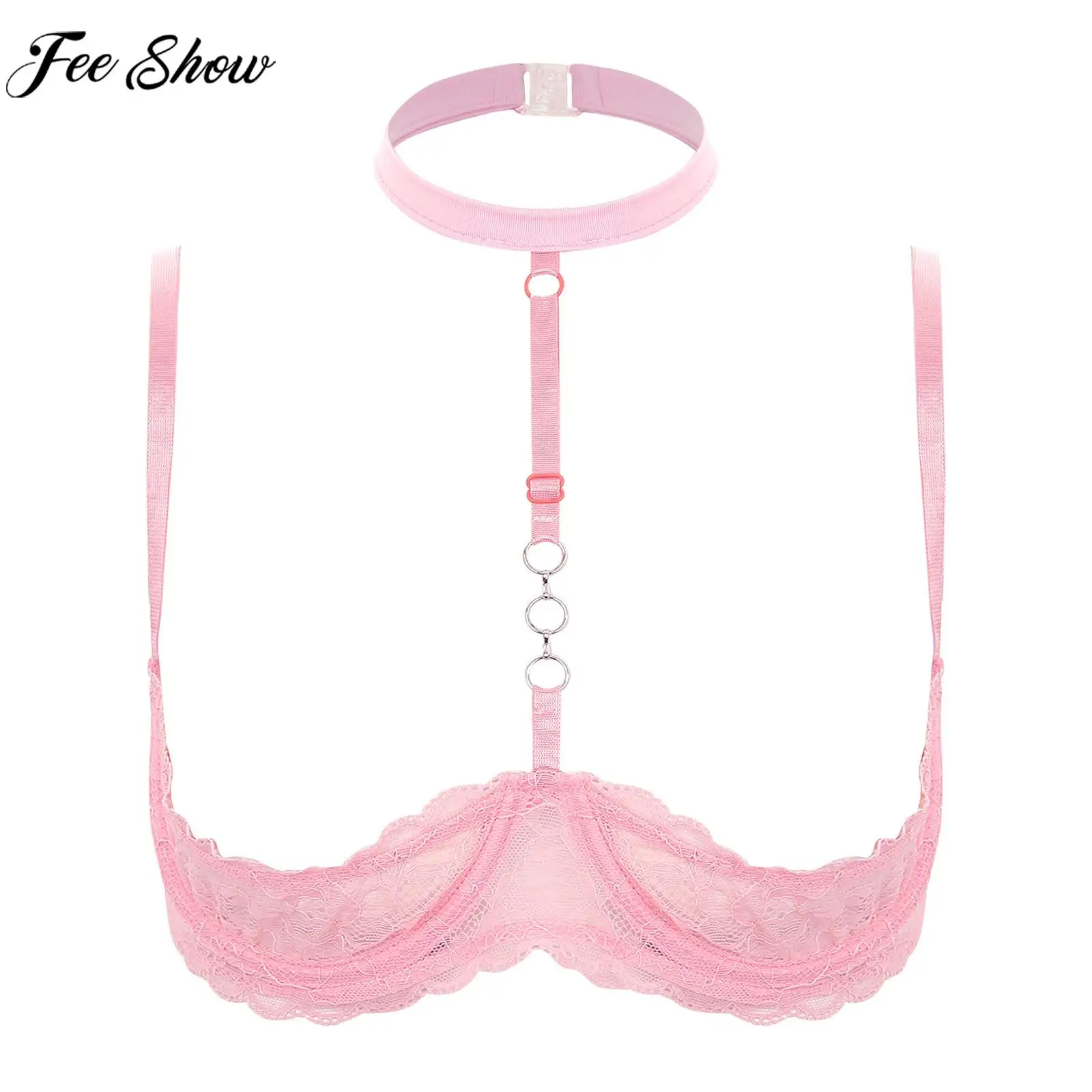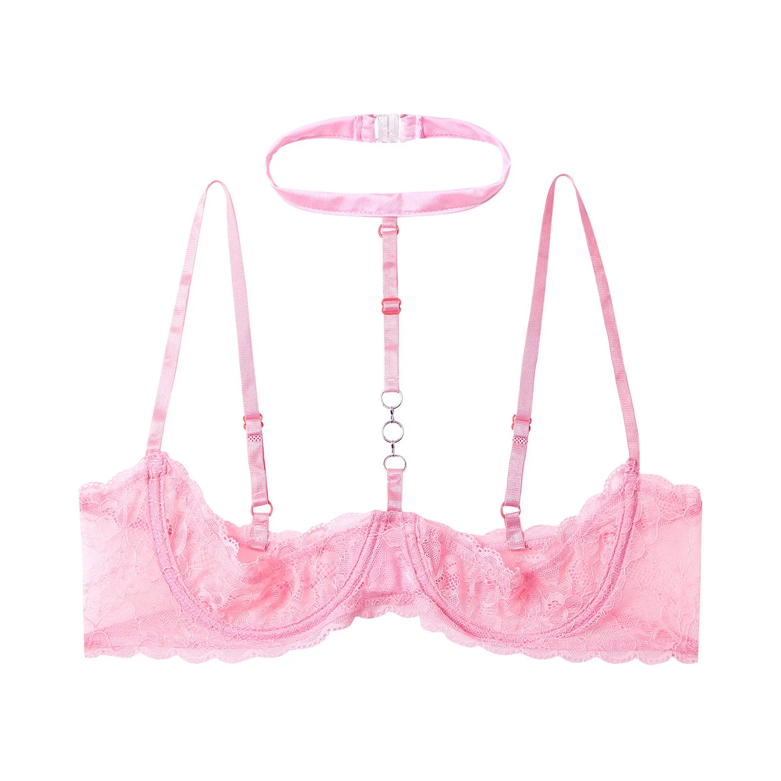 Womens 1/4 Cups Underwire Bra Halter Neck O Ring Sheer Lace Push Up Brassiere Underwear.