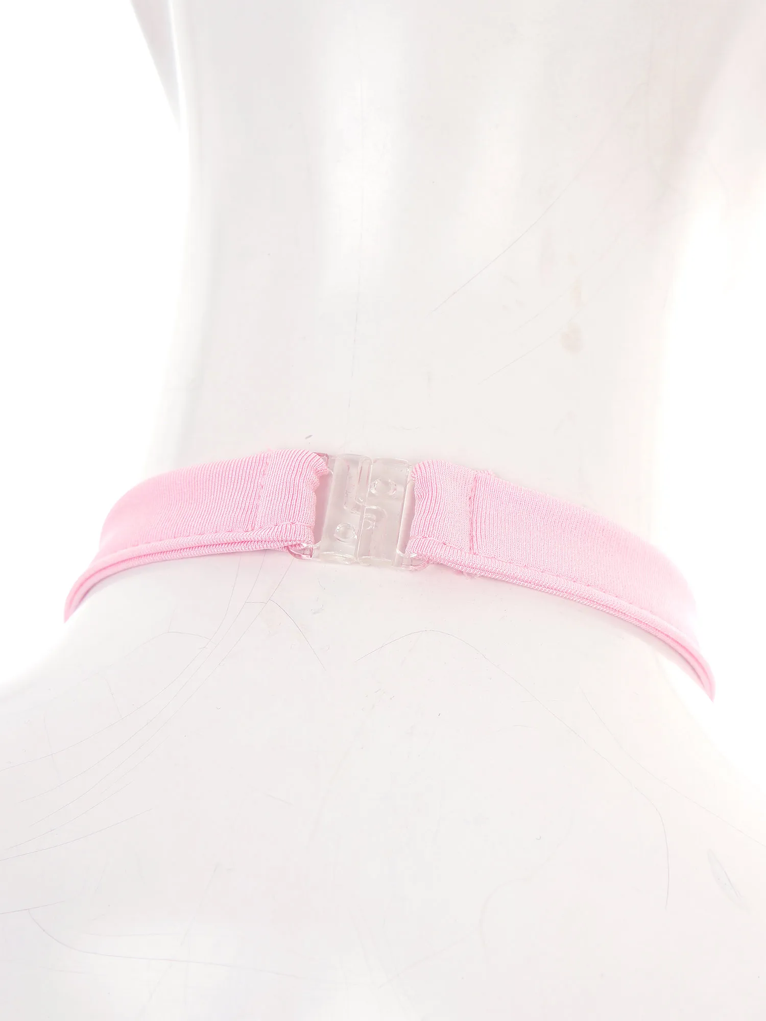 Halter neck with o ring, scalloped trim 1/4 cups and underwired design for a good support.